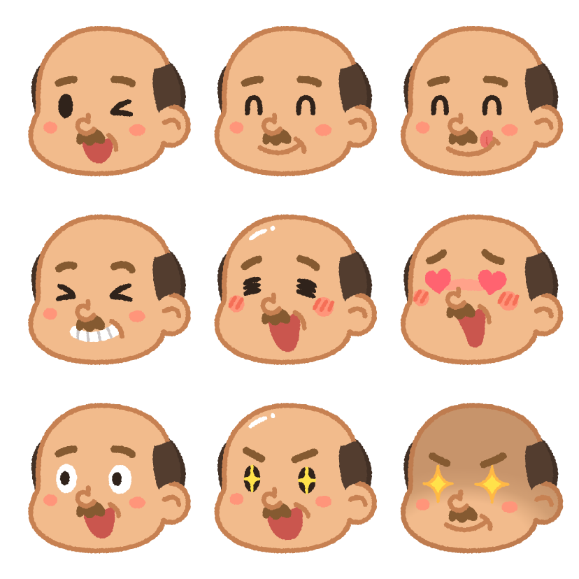 おじさんの色んな表情(笑顔) 笑っていたり喜んでいたりハート目だったり目を輝かせているおじさんの表情パーツです。 画像をダウンロード ご使用前にご利用規約とよくあるご質問を必ずお読みください。 SNSで共有クリックして Tumblr で共有 (新しいウィンドウで開きます)Facebook で共有するにはクリックしてください (新しいウィンドウで開きます)Click to share on Twitter (新しいウィンドウで開きます)クリックして WhatsApp で共有 (新しいウィンドウで開きます)クリックして Pinterest で共有 (新しいウィンドウで開きます) タグ おじさんパーツ男表情
