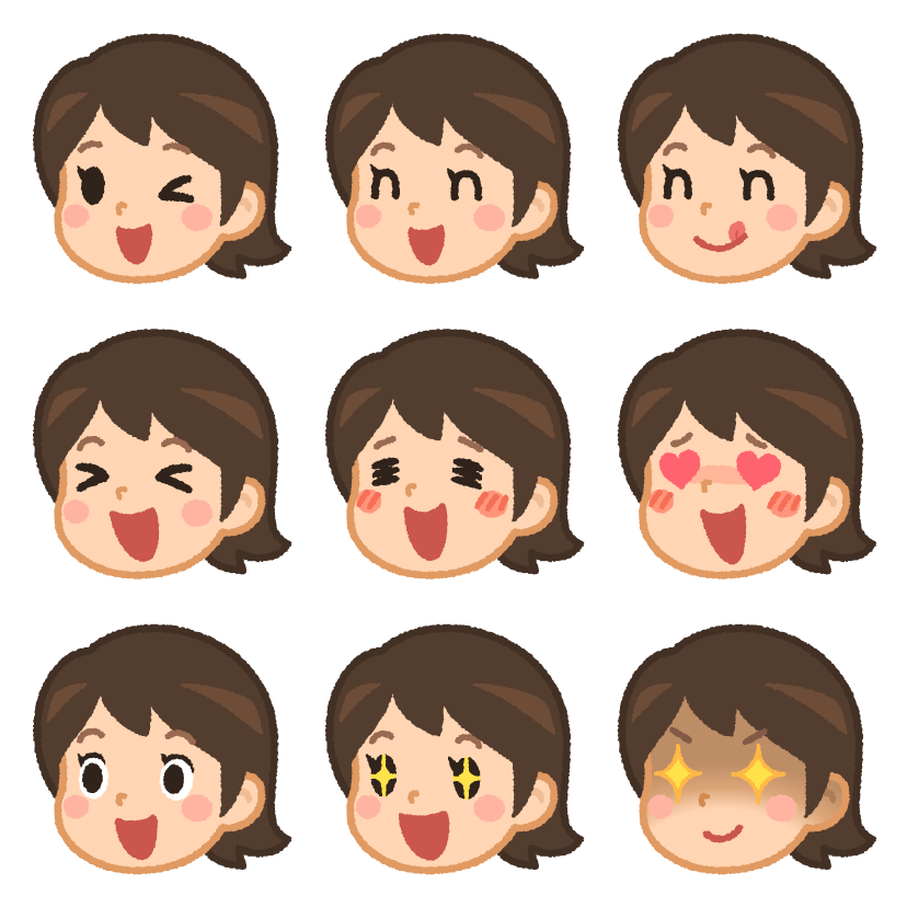 女性の色んな表情(笑顔) 笑っていたり喜んでいたりハート目だったり目を輝かせている女性の表情パーツです。 画像をダウンロード ご使用前にご利用規約とよくあるご質問を必ずお読みください。 SNSで共有クリックして Tumblr で共有 (新しいウィンドウで開きます)Facebook で共有するにはクリックしてください (新しいウィンドウで開きます)Click to share on Twitter (新しいウィンドウで開きます)クリックして WhatsApp で共有 (新しいウィンドウで開きます)クリックして Pinterest で共有 (新しいウィンドウで開きます) タグ パーツ女表情