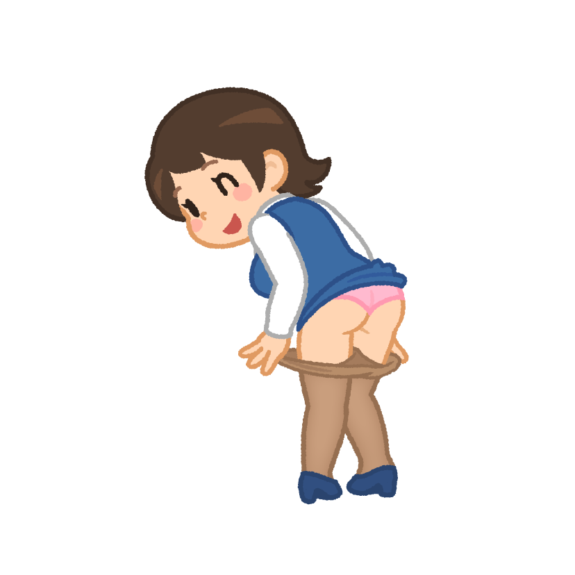 背中を向けてタイツを脱ぎ、パンティが丸見えになっている笑顔の女性会社員のエロストです。